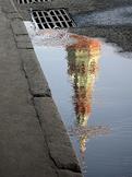 Жанровая фотография. Отражение одной из башен Кремля в луже с водой.
