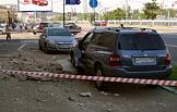 Жанровая фотография. Автомобили припаркованные за ограждение, там где идет ремонт фасада здания. Поврежденный автомобиль "Тойота".