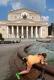Жанровая фотография. Жара в городе. Женщина купается в фонтане у здания Государственного академического Большого театра (ГАБТ) на Театральной площади.