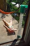 Жанровая фотография. Жара в городе. Девушка загорает на дачном участке.