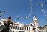 Жанровая фотография. Жара в городе. Работник ЖКХ поливает водой площадь у Киевского вокзала.