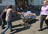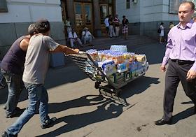 жанровая фотография. Жара в городе. Грузчики везут на тележке прохладительные напитки у здания Киевского вокзала.