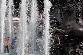 Жанровая фотография. Жара в городе. Люди купаются в фонтане на Манежной площади.