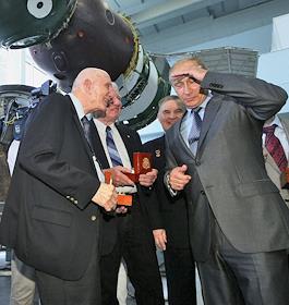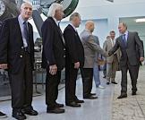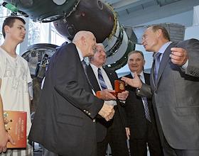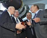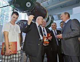 Посещение председателем правительства России Владимиром Путиным ОАО "Ракетно-космической корпорации "Энергия" им. С.П.Королева". Слева направо: космонавты-ветераны - участники легендарной стыковки "Союза" и "Аполлона" Томас Стаффорд, Венс Бранд, Валерий Кубасов и председатель правительства России Владимир Путин во время встречи в музее РКК "Энергия".