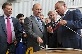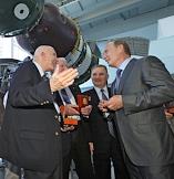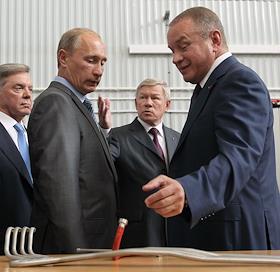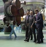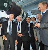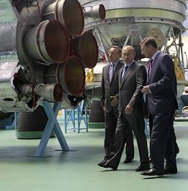 Посещение председателем правительства России Владимиром Путиным ОАО "Ракетно-космической корпорации "Энергия" им. С.П.Королева". Слева направо: президент-генеральный конструктор РКК "Энергия" Виталий Лопота, председатель правительства России Владимир Путин и заместитель председателя правительства России Сергей Иванов во время посещения контрольно-испытательной станции РКК "Энергия" им. С.П.Королева, где проводится заключительная проверка всех космических аппаратов.