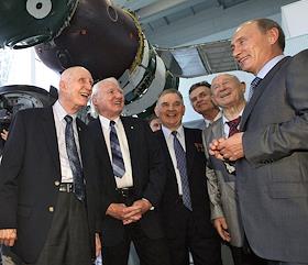 Посещение председателем правительства России Владимиром Путиным ОАО "Ракетно-космической корпорации "Энергия" им. С.П.Королева". Слева направо: космонавты-ветераны - участники легендарной стыковки "Союза" и "Аполлона" Томас Стаффорд, Венс Бранд, Валерий Кубасов, Алексей Леонов и председатель правительства России Владимир Путин во время встречи в музее РКК "Энергия".