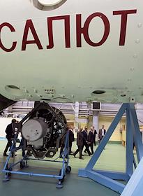 Посещение председателем правительства России Владимиром Путиным ОАО "Ракетно-космической корпорации "Энергия" им. С.П.Королева". Председатель правительства России Владимир Путин (второй слева) и заместитель председателя правительства России Сергей Иванов (второй справа) во время посещения контрольно-испытательной станции РКК "Энергия" им. С.П.Королева, где проводится заключительная проверка всех космических аппаратов.