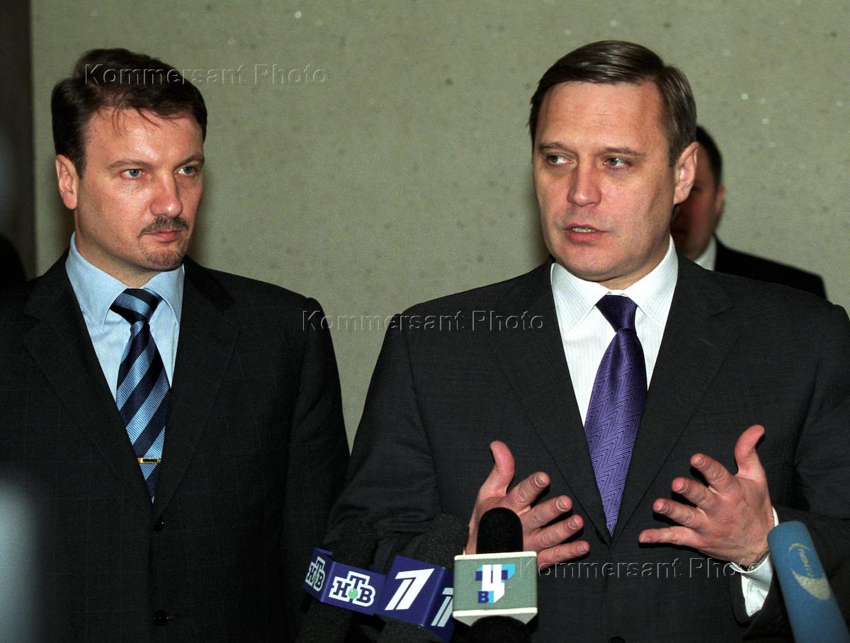 Russian Prime Minister Mikhail Kasyanov (right) and head of the Trade and Economic Development Ministry (MERT) German Gref (left) are interviewed after the extended session of the MERT College summoned to discuss economic results of 2001 and outline government plans for 2002.