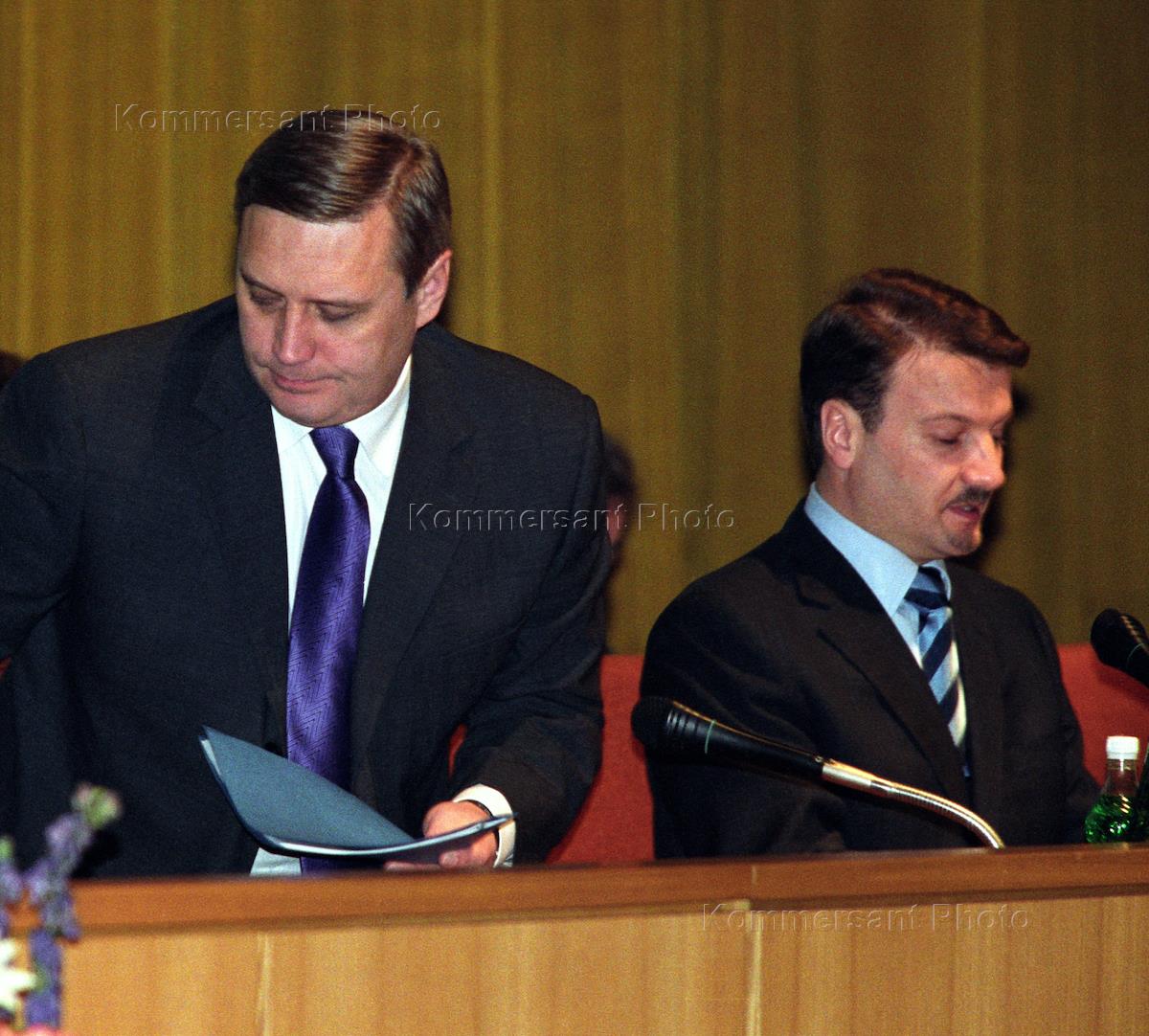 Russia's Trade and Economic Development Minister German Gref (left) and Prime Minister Mikhail Kasyanov (right) attend the extended meeting of the Trade and Economic Ministry College. The meeting was held to sum up the 2001 results and outline tasks for 2002.