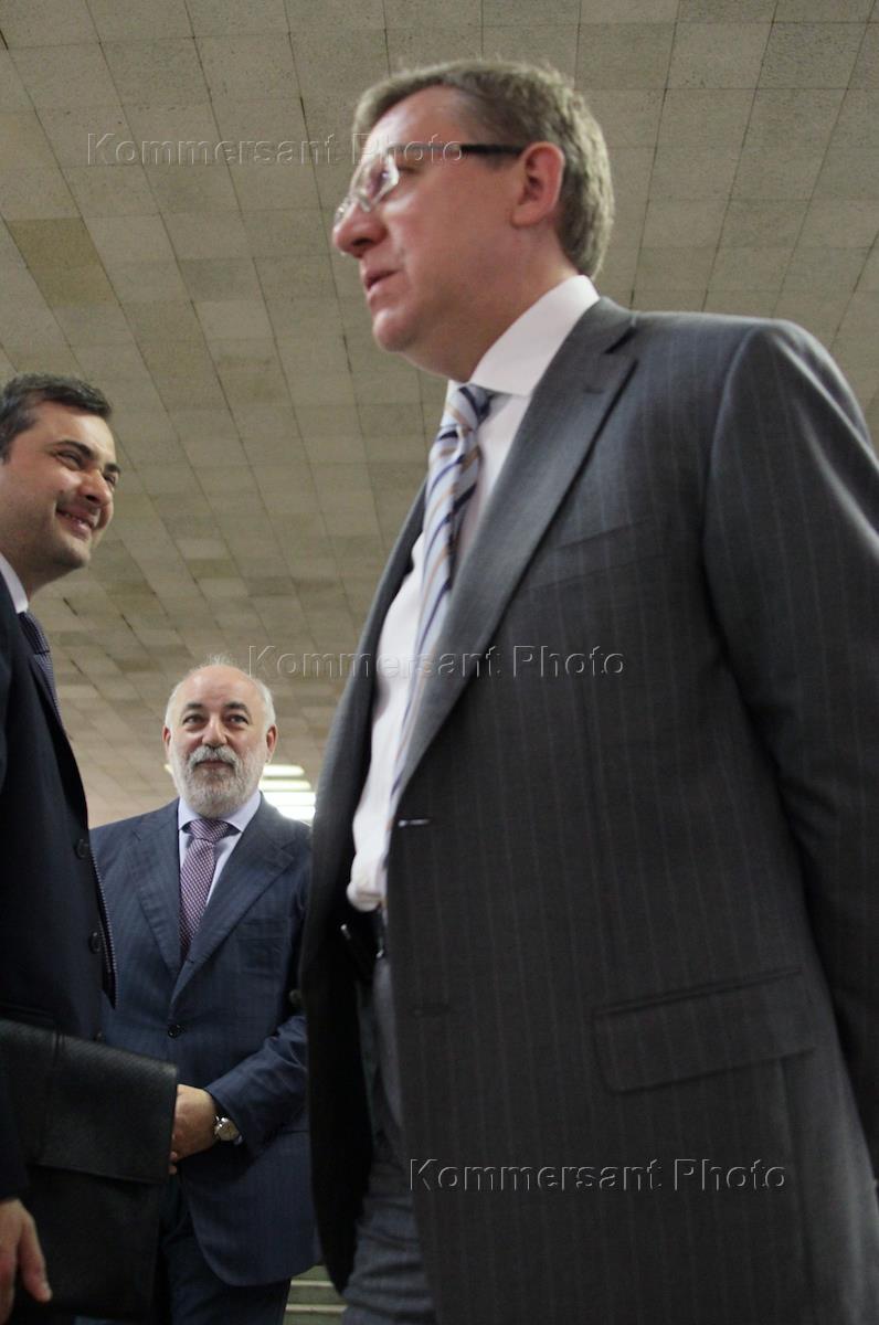 Слева направо: первый заместитель руководителя администрации президента России Владислав Сурков, председатель совета директоров "Ренова", председатель Комитета по международной деятельности РСПП Виктор Вексельберг и заместитель председателя правительства России, министр финансов Алексей Кудрин перед заседанием комиссии по модернизации и технологическому развитию экономики России. Заседание прошло в Национальном исследовательском технологическом университете (НИТУ) "Моского института стали и сплавов" (МИСиС).