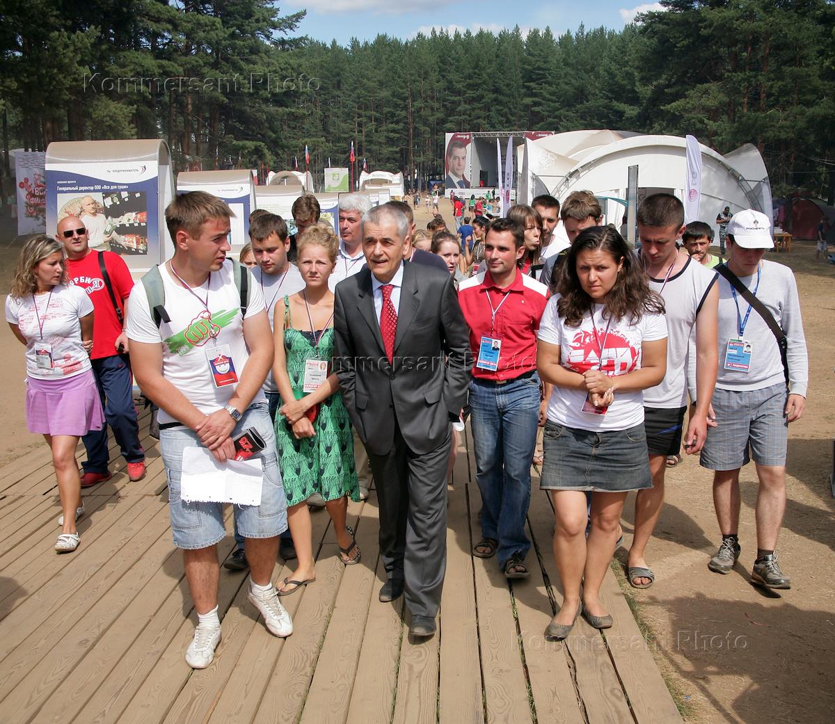 Руководитель Федеральной службы по надзору в сфере защиты прав потребителей и благополучия человека Геннадий Онищенко (в центре) на Всероссийском молодежном инновационном форуме "Селигер 2010".