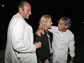 9-й Международный конкурс молодых исполнителей популярной музыки "Новая волна-2010". Слева направо: председатель совета директоров MosCityGroup Павел Фукс, телеведущая Ксения Собчак и бизнесмен Умар Джабраилов на вечеринке по случаю первого конкурсного дня. Вечеринка прошла в ресторане La Riva.