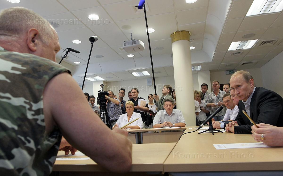 Председатель правителсьва России Владимир Путин (справа) во время встречи с жителями Луховицкого района, дома которых сгорели в результате лесных пожаров. Встреча прошла в научно-технологическом центре ООО "Газпром-ВНИИГАЗ".