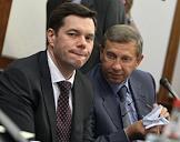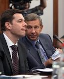 Директор Российского научного центра "Курчатовский институт" Михаил Ковальчук (слева) и президент группы ОНЭКСИМ Михаил Прохоров (справа) на заседании правительственной комиссии по высоким технологиям и инновациям в научно-исследовательском институте природных газов и газовых технологий "Газпром-ВНИИГАЗ" в поселке Развилка Московской области.