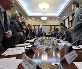 Директор Российского научного центра "Курчатовский институт" Михаил Ковальчук (второй справа) и президент группы ОНЭКСИМ Михаил Прохоров (справа) на заседании правительственной комиссии по высоким технологиям и инновациям в научно-исследовательском институте природных газов и газовых технологий "Газпром-ВНИИГАЗ" в поселке Развилка Московской области.