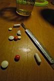 Жанровая фотография. Сстакан с водой, градусник и разноцветные таблетки на столе.
