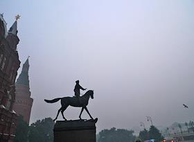 Жанровая фотография. Смог от торфяных и лесных пожаров над Москвой. Памятник маршалу Георгию Жукову.