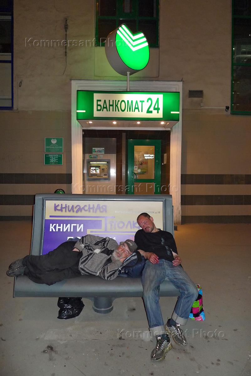 Жанровая фотография. Мужчины спят на скамейке у банкомата Сбербанка России.