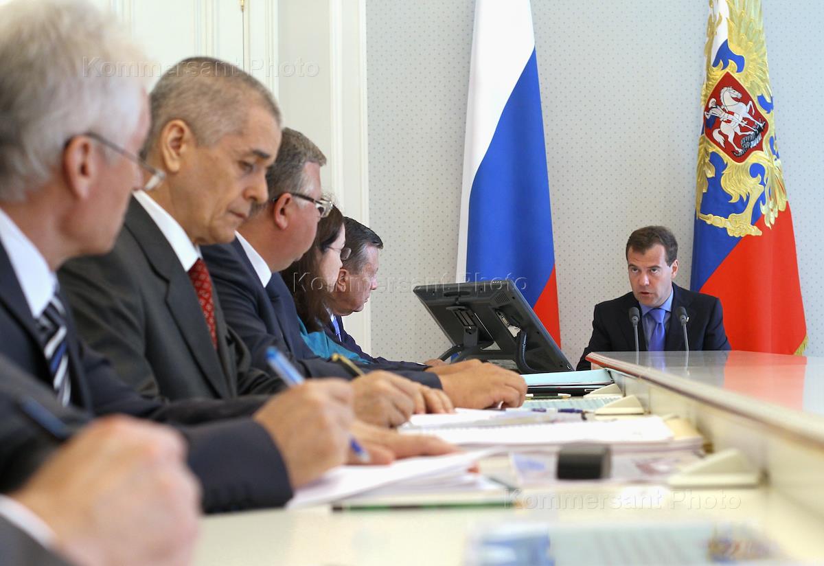 Совещание президента России по вопросам инвестиционного климата в России. Слева направо: руководитель Федеральной службы по надзору в сфере защиты прав потребителей и благополучия человека Геннадий Онищенко, руководитель Федеральной таможенной службы (ФТС) России Андрей Бельянинов, министр экономического развития России Эльвира Набиуллина, первый заместитель председателя Правительства России Виктор Зубков и президент России Дмитрий Медведев.