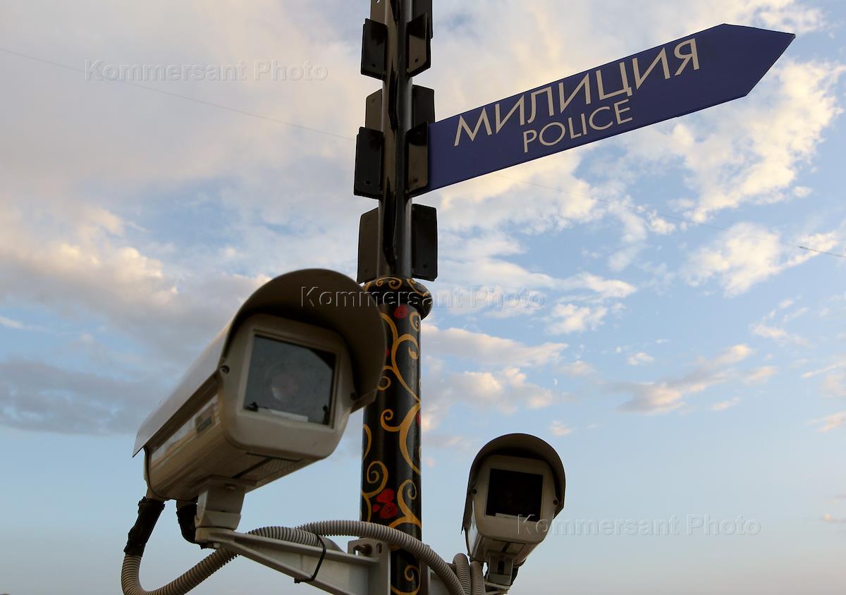 Жанровая фотография. Указатель "Милиция. Police" и камеры наружного наблюдения.