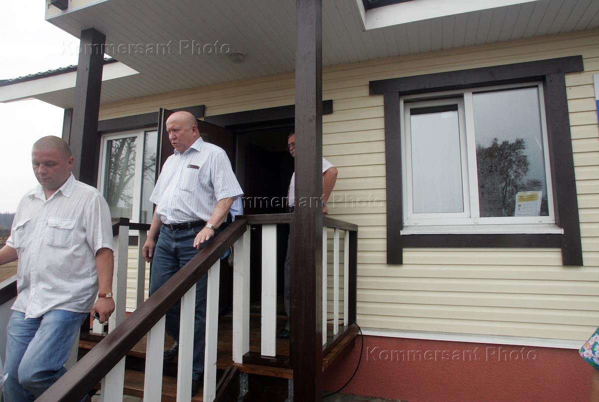 Губернатор Валерий Шанцев (в центре) выходит из нового дома, построенного для погорельцев села Верхняя Верея.