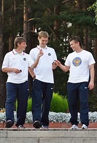 Слева направо: футолисты Андрей Аршавин, Динияр Белялетдинов и Марат Измайлов во время рекламной акции спортивной форма сборной России для ProSport.