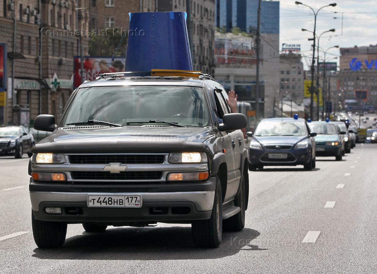 Акция против принятого "сухого закона" для водителей, организованная обществом "Синих ведерок". Участники акции проехали по центральным улицам Москвы.