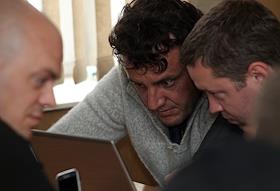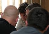 Владелец холдинга "РАТМ" Эдуард Таран (в центре), обвиняемый в даче взятки, на рассмотрении ходатайства на его арест в Замоскворецком суде.