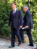 Премьер-министр Люксембурга Жан-Клод Юнкер (слева) и президент России Дмитрий Медведев (справа) во время встречи в резиденции "Бочаров ручей".