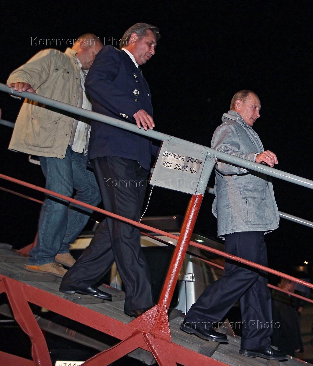 Председатель правительства России Владимир Путин (справа) во время осмотра в Петропавловске-Камчатском большого морозильного автономного траулера "Михаил Станицын".