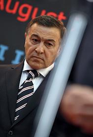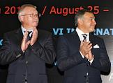 Первый заместитель председателя Государственной думы России Олег Морозов (слева) и президент Crocus Group Араз Агаларов (справа) на открытии Московского Международного Автомобильного салона (ММАС) 2010 и 6-й Международной автомобильной выставки "Интеравто" в Международном выставочном центре (МВЦ) "Крокус Экспо".