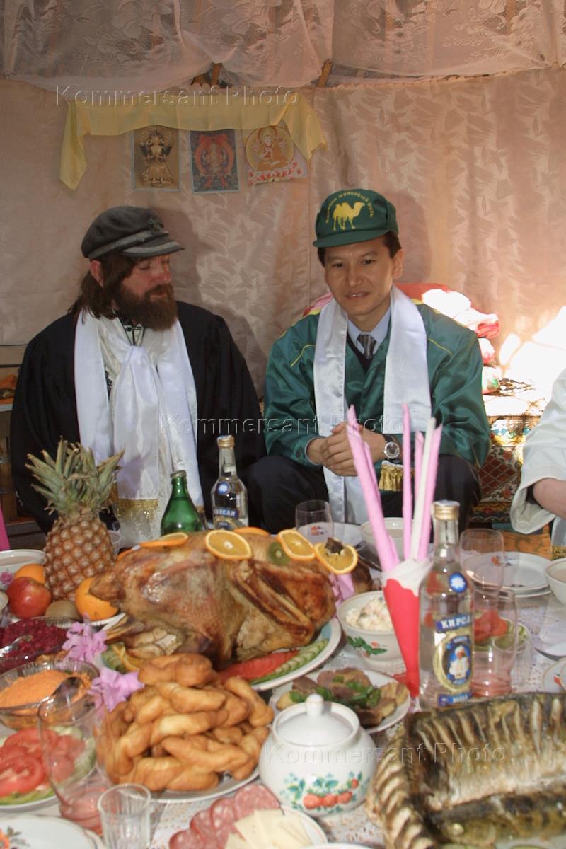 Известный российский путешественник Федор Конюхов и его товарищи решили повторить маршрут первооткрывателей Великого шелкового пути, сыгравшего большую роль в налаживании экономических и культурных связей народов Китая и азиатских стран. Экспедиция Федора Конюхова на 13 верблюдах и 10 лошадях стартовала из старого калмыцкого поселка Цаган-аман (Белые ворота). Президент Республики Калмыкия Кирсан Илюмжинов (справа) и Ф.Конюхов во время Торжественного старта экспедиции.