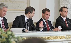 Совместное заседание Госсовета России и комиссии по модернизации и технологическому развитию экономики. Слева направо: заместитель председателя правительства России - руководитель аппарата правительства России Сергей Собянин, первый заместитель руководителя администрации президента России Владислав Сурков, президент России Дмитрий Медведев и руководитель администрации президента России Сергей Нарышкин во время заседания, посвященного развитию профессионального образования. Заседание прошло в Кремле.
