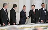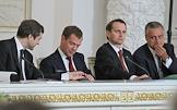 Совместное заседание Госсовета России и комиссии по модернизации и технологическому развитию экономики. Слева направо: первый заместитель руководителя администрации президента России Владислав Сурков, президент России Дмитрий Медведев, руководитель администрации президента России Сергей Нарышкин и помощник президента России Александр Абрамов во время заседания, посвященного развитию профессионального образования. Заседание прошло в Кремле.