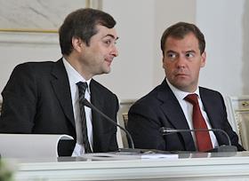 Первый заместитель руководителя администрации президента России Владислав Сурков (слева) и президент России Дмитрий Медведев (справа) на совместном заседании Госсовета России и комиссии по модернизации и технологическому развитию экономики, посвященном развитию профессионального образования в России. Заседание прошло в Кремле.