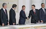 Президент России Дмитрий Медведев (в центре) на совместном заседании Госсовета России и комиссии по модернизации и технологическому развитию экономики, посвященном развитию профессионального образования в России. Заседание прошло в Кремле.