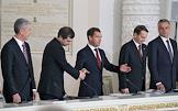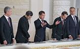 Совместное заседание Госсовета России и комиссии по модернизации и технологическому развитию экономики. Слева направо: заместитель председателя правительства России - руководитель аппарата правительства России Сергей Собянин, первый заместитель руководителя администрации президента России Владислав Сурков, президент России Дмитрий Медведев, руководитель администрации президента России Сергей Нарышкин и помощник президента России Александр Абрамов во время заседания, посвященного развитию профессионального образования. Заседание прошло в Кремле.