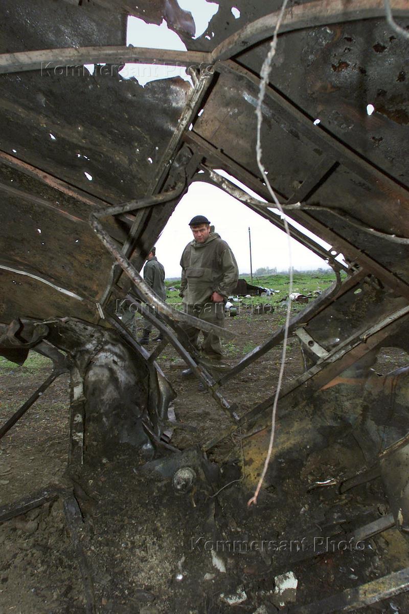 Командир чеченского ОМОНа Муса Газимагомедов около сгоревшего автобуса, где погибли 16 омоновцев из отряда города Грозного в результате террористического взрыва. После этого преступления грозненский ОМОНа провел зачистку боевиков приуроченную ко дню гибели первого президента Чечни Джохара Дудаева, который боевики традиционно отмечают терактами.