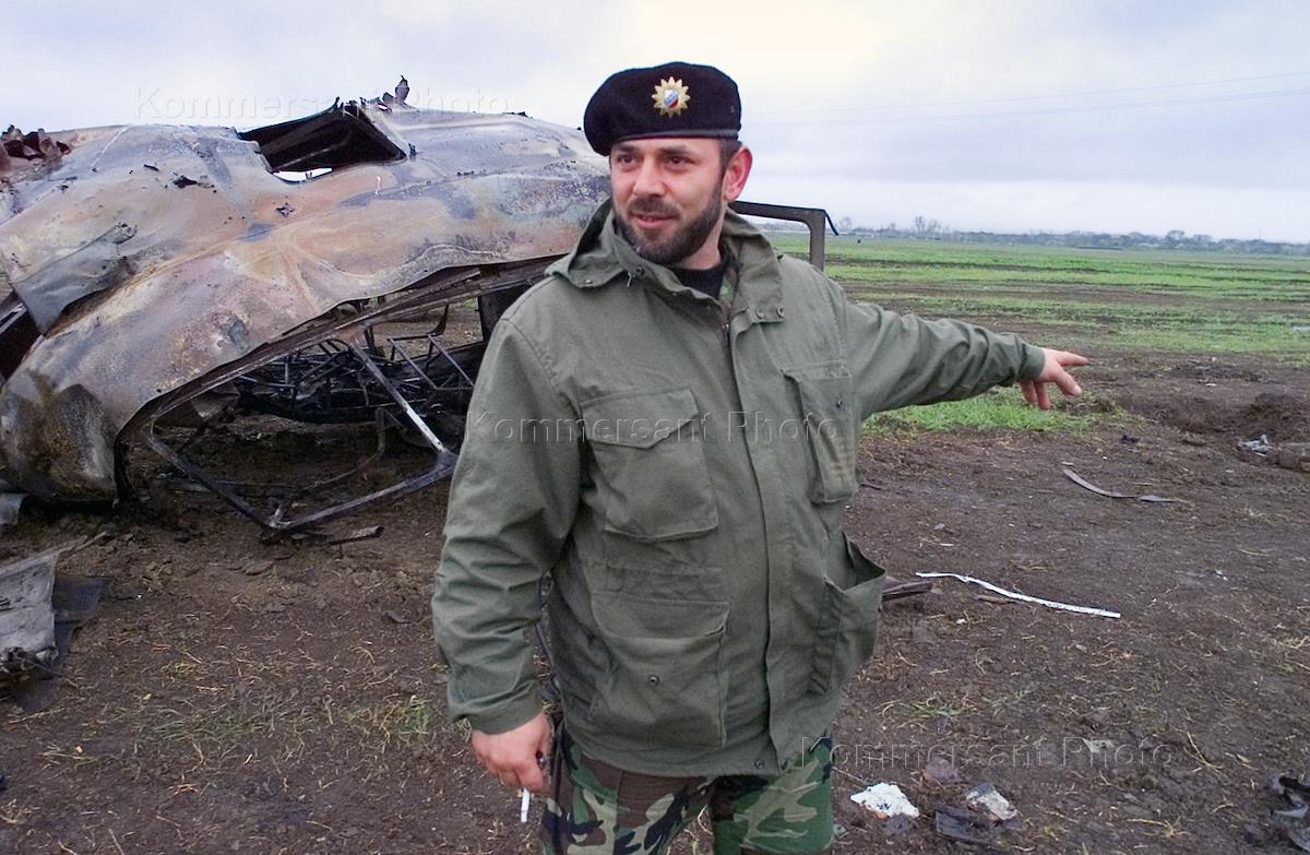 Командир чеченского ОМОНа Муса Газимагомедов около сгоревшего автобуса, где погибли 16 омоновцев из отряда города Грозного в результате террористического взрыва. После этого преступления грозненский ОМОНа провел зачистку боевиков приуроченную ко дню гибели первого президента Чечни Джохара Дудаева, который боевики традиционно отмечают терактами.