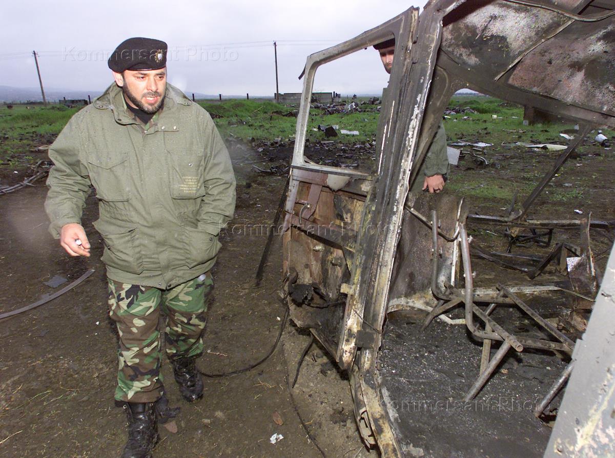 Командир чеченского ОМОНа Муса Газимагомедов около сгоревшего автобуса, где погибли 16 омоновцев из отряда города Грозного в результате террористического взрыва. После этого преступления грозненский ОМОНа провел зачистку боевиков приуроченную ко дню гибели первого президента Чечни Джохара Дудаева, который боевики традиционно отмечают терактами.
