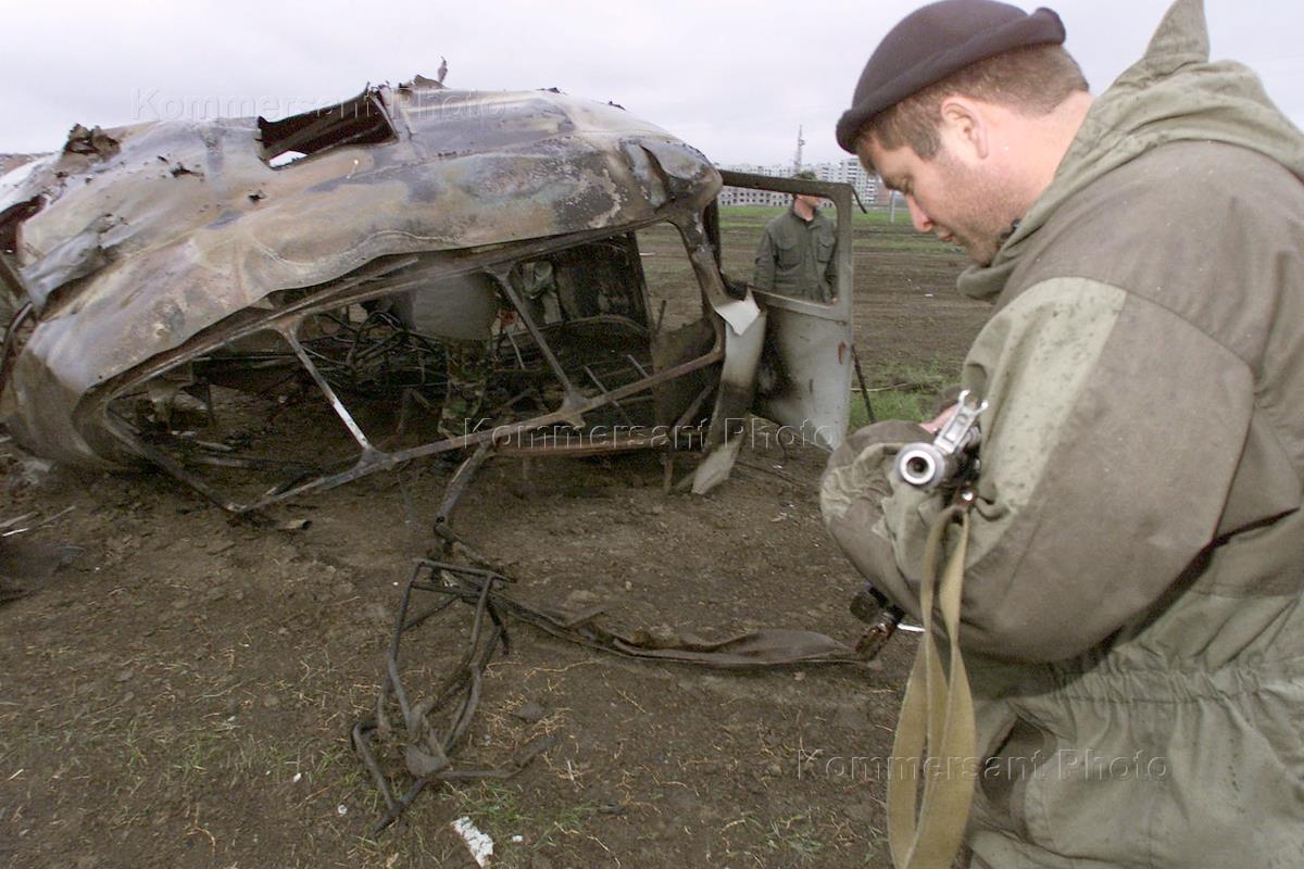 Командир чеченского ОМОНа Муса Газимагомедов около сгоревшего автобуса, где погибли 16 омоновцев из отряда города Грозного в результате террористического взрыва. После этого преступления грозненский ОМОНа провел зачистку боевиков приуроченную ко дню гибели первого президента Чечни Джохара Дудаева, который боевики традиционно отмечают терактами.