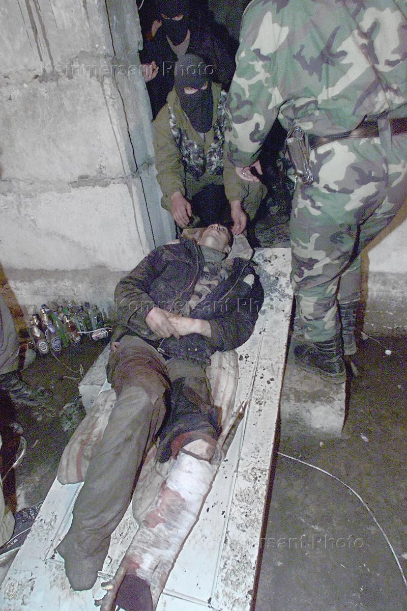 Подозреваемый во взрыве 16 омоновцев в городе Грозном Аслан Атгериев (слева) во время задержания его бойцами ОМОН на месте преступления. Спецоперация ОМОНа проводилась в связи с днем гибели первого президента Чечни Джохара Дудаева, который боевики традиционно отмечают терактами.