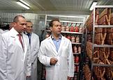 Рабочая поездка президента России Дмитрия Медведева в Приволжский федеральный округ. Президент России Дмитрий Медведев (в центре) и губернатор Саратовской области Павел Ипатов (справа) во время посещения мясокомбинате "Митэк".