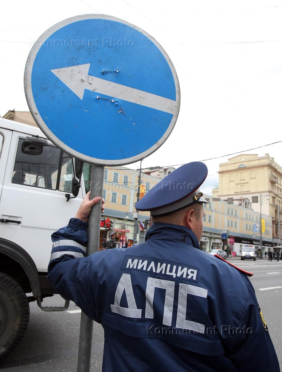 41st Militia combined relay on the Garden Ring (start and finish on Triumph Square). Employees of the traffic police officers preparing for the relay.
