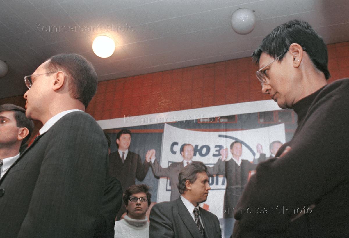 Руководитель фракции "Союз правых сил" (СПС) в Государственной Думе России Сергей Кириенко (слева) и сопредседатель движения (СПС) Ирина Хакамада (справа) на конференции политического движения "Союз правых сил", которая состоялась в здании Финансовой Академии.