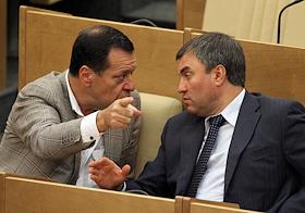 Председатель комитета Государственной думы (ГД) России по бюджету и налогам Юрий Васильев (слева) и заместитель председателя ГД Вячеслва Володин (справа) на заседании Госдумы.