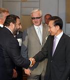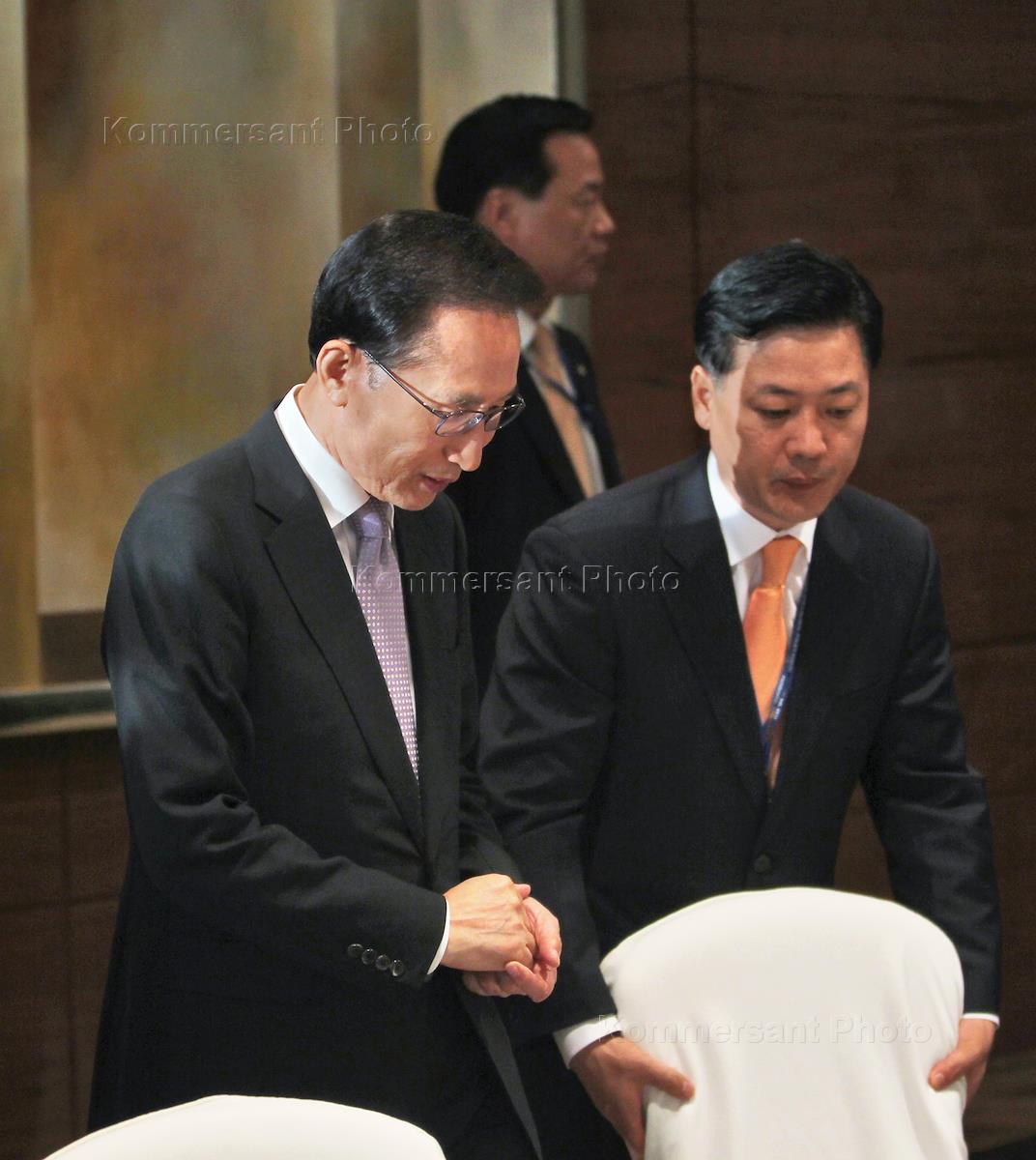 Президент Республики Корея Ли Мен Бак (слева) на встрече с российскими бизнесменами в гостинице "Лотте".