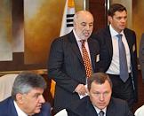 Председатель совета директоров Группы компаний "Тройка-Диалог" Рубен Варданян (слева) и президент Российского союза промышленников и предпринимателей (РСПП) Александр Шохин (в центре) во время встречи президента Республики Корея Ли Мен Бака (справа) с российскими бизнесменами в гостинице "Лотте".