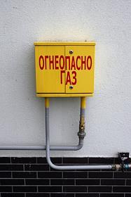 Жанровая фотография. Щит с надписью "Огенопасно. Газ" в коттеджном поселке "Высокий берег".