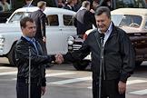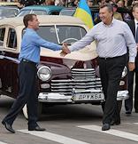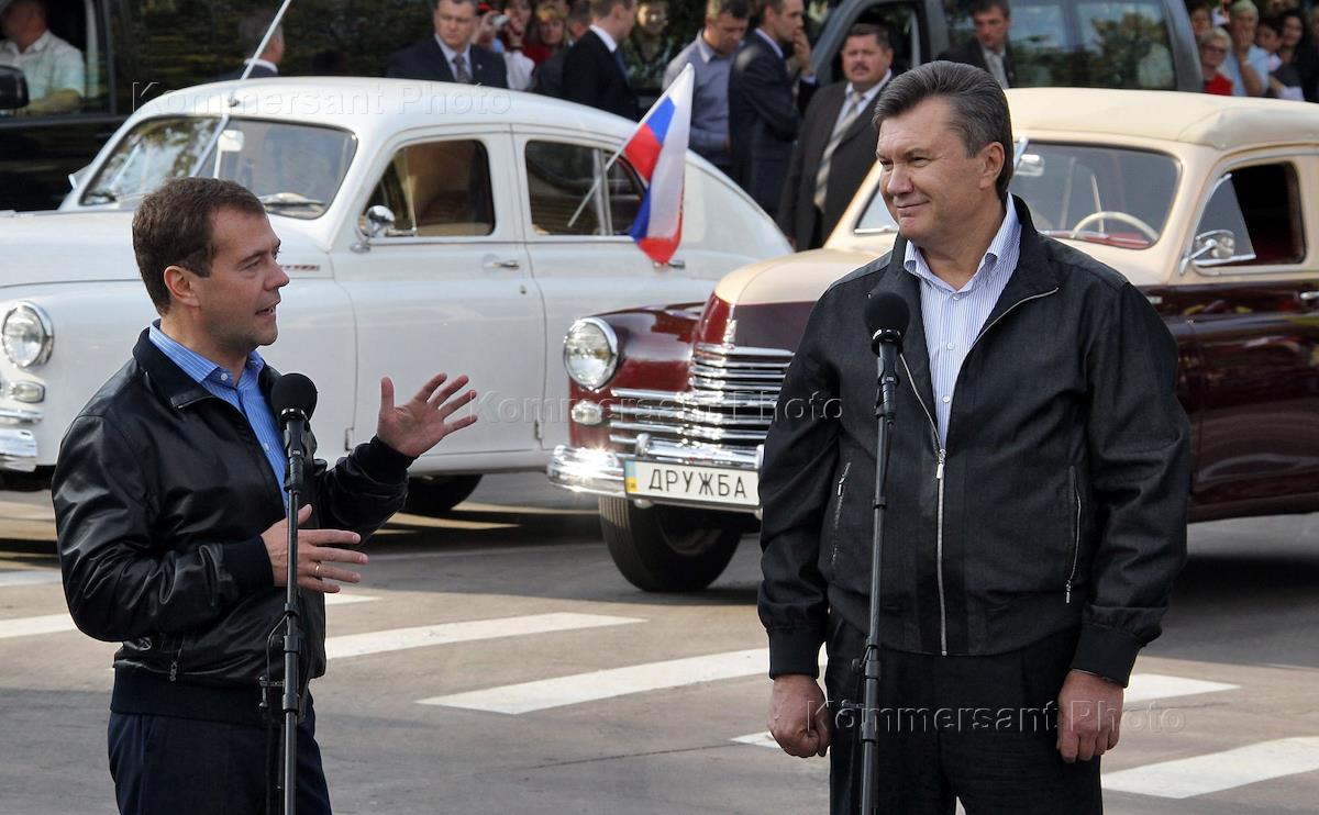 Президент России Дмитрий Медведев (слева) и президент Украины Виктор Янукович (справа) во время визита в город Глухов в составе автопробега Санкт-Петербург - Киев.